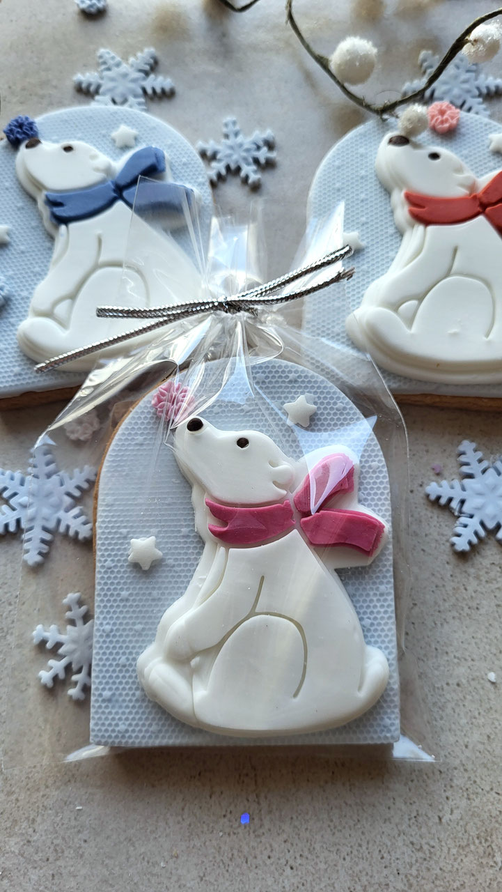 Kekse Vanillegeschmack 6 cm, liebevoll dekoriert mit Fondant. Sie werden festlich in durchsichtige Tütchen mit Schleifchen eingepackt.